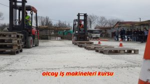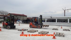 Forklift Ehliyeti Sınavına giren operatör adayları Eğitim aldıkları Forklift ile